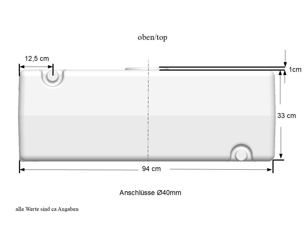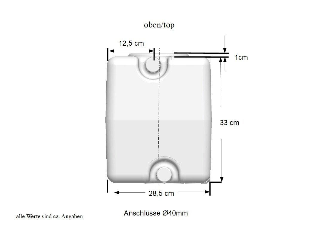 - Anschlüsse: 4 x (s. Bilder) , Durchmesser 40 mm (z.B zum Anschluss eines HT Rohrs DN40 aus der Sanitärinstallation), im Auslieferzustand verschlossen